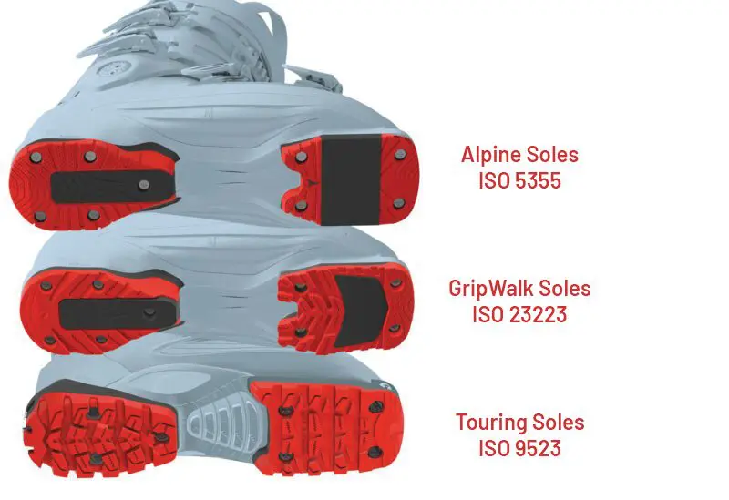 Alpine (DIN) soles – ISO 5355: These are the most common sole types, found on most inbound boots and race boots. They have been around the longest and offer the best binding and boot coupling interface but they are not the best for walking around due to low grip.