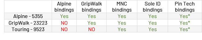 Binding Compatibility: Gripwalk, MNC, Sole ID, Pin Tech