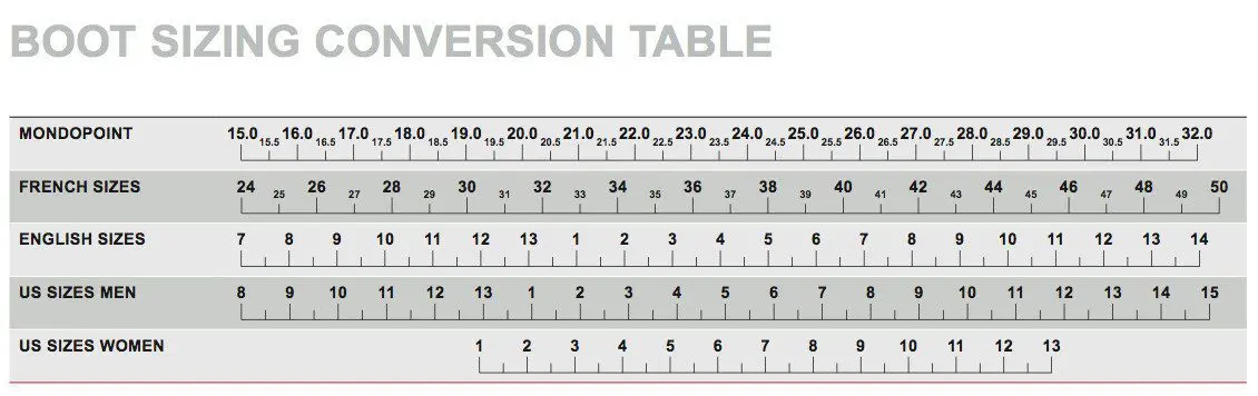 All ski boots are measured in centimetres also known as Mondo Point. Shoe sizes don’t exactly crossover with CM so the only true way to find you size is measure your foot in CM.