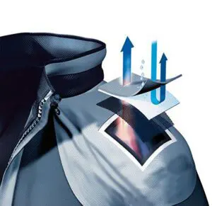 Waterproof/breathable fabrics have pores large enough for water vapour to escape, but small enough to prevent liquid passing through. The garment must be able to breathe from the inside out, otherwise during activity perspiration moisture cannot escape. The garment becomes wet on the inside and the body’s temperature will drop because of it.